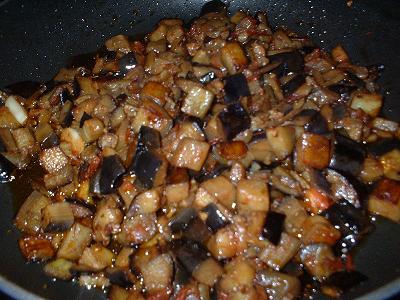 Tagliare le melanzane a pezzetti e versare in una padella insieme al pomodoro a pezzetti, il sale, l'origano e olio. Soffriggere per almeno 10- 15 a fiamma media